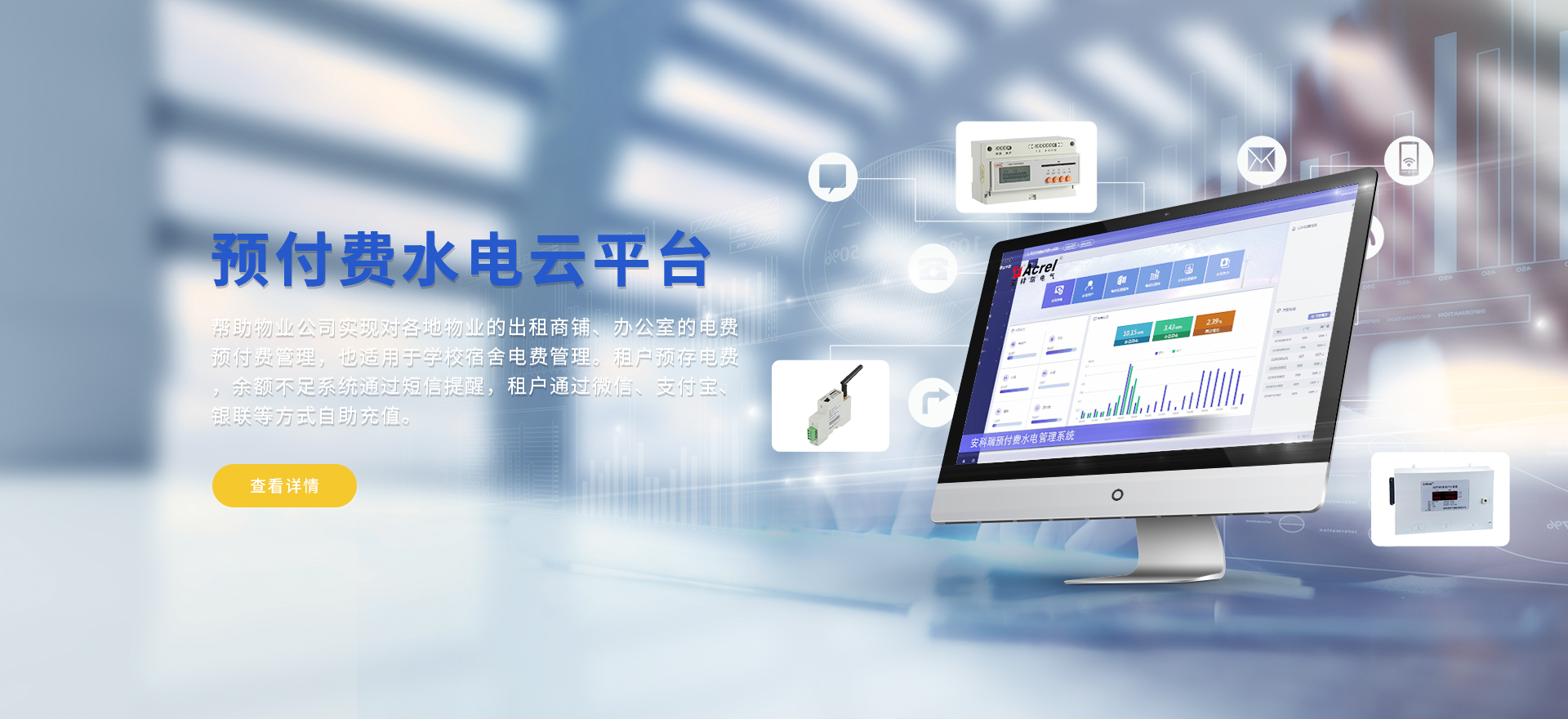 安科瑞提供的解決方案包括Acrel-EIoT能源物聯網云平臺、變電所運維云平臺、安全用電管理云平臺、環保用電監管云平臺智慧消防云平臺能源管理云平臺、工業企業能源管控平臺、遠程預付費云平臺、餐飲油煙監管云平臺、電動汽車/電瓶車充電樁收費管理云平臺、電力監控/無線測溫系統、電能質量治理系統、電氣火災監控系統、消防設備電源監控系統、防火門監控系統、應急照明和疏散指示系統、智能照明控制系統、醫用隔離電源絕緣監測系統等,幫助用戶實現能源智能化、可視化、精細化管理,提高用能效率和用能安全,為企業節能降耗和實現能源數字化建設提供數據服務。